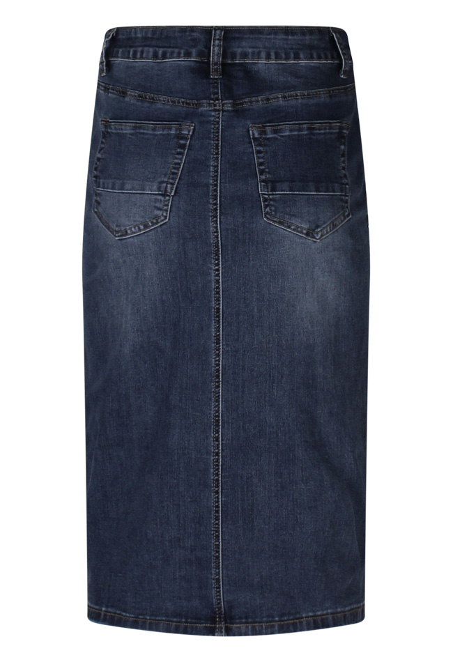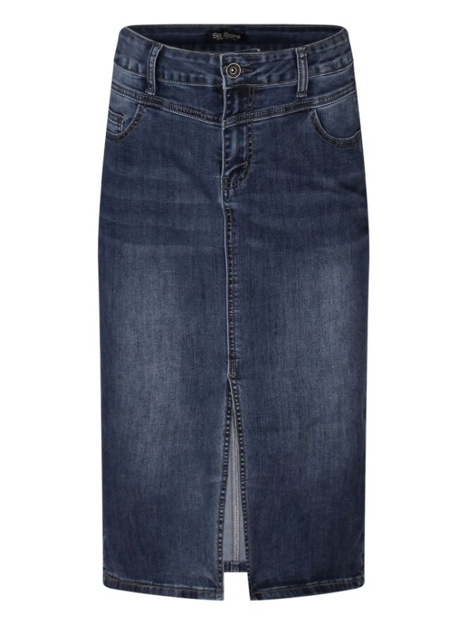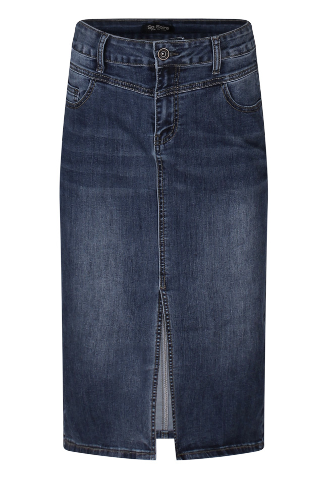 Denim it is! Deze spijkerrok is een lang model, 5 pocket en heeft een split aan de voorkant. Deze rok heeft een mooie blauwe lichte used look wassing. Deze rokken zijn helemaal hot en trending en super leuk te combineren met een simpel T-shirtje maar ook met een leuke top, sweater of gilet.