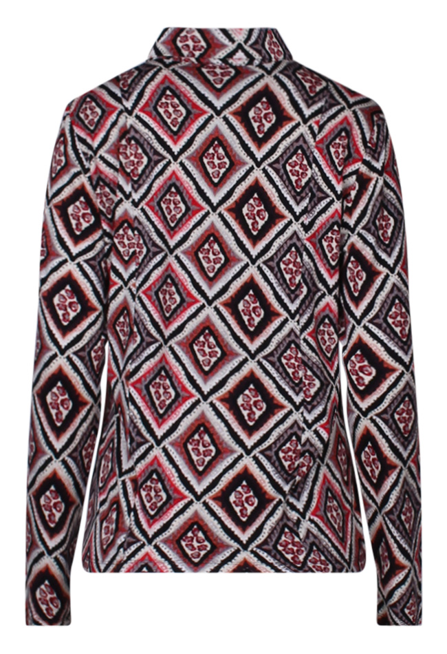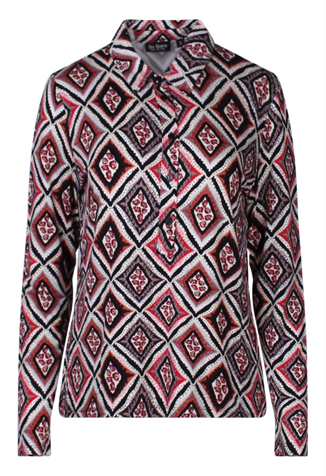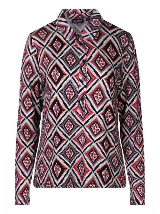 Top met een kleurrijke ikat print, polo kraag en knoopsluiting bij de hals. Super leuk te combineren op een jeans.