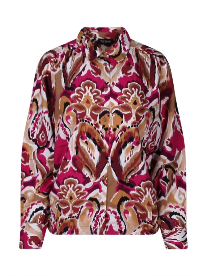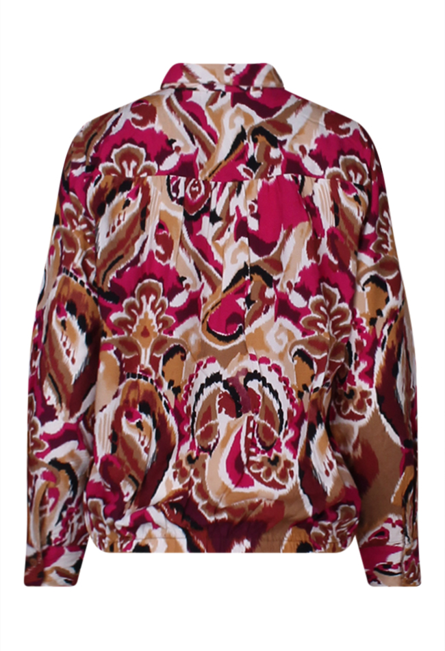 Deze dames blouse heeft een klassieke kraag, knoopsluiting en lange mouwen met manchetten en twee knoopjes. Het elastiek in de boord zorgt voor een goede pasvorm. De blouse is voorzien van een aquarel paisley print, ideaal voor een stijlvolle en comfortabele look.