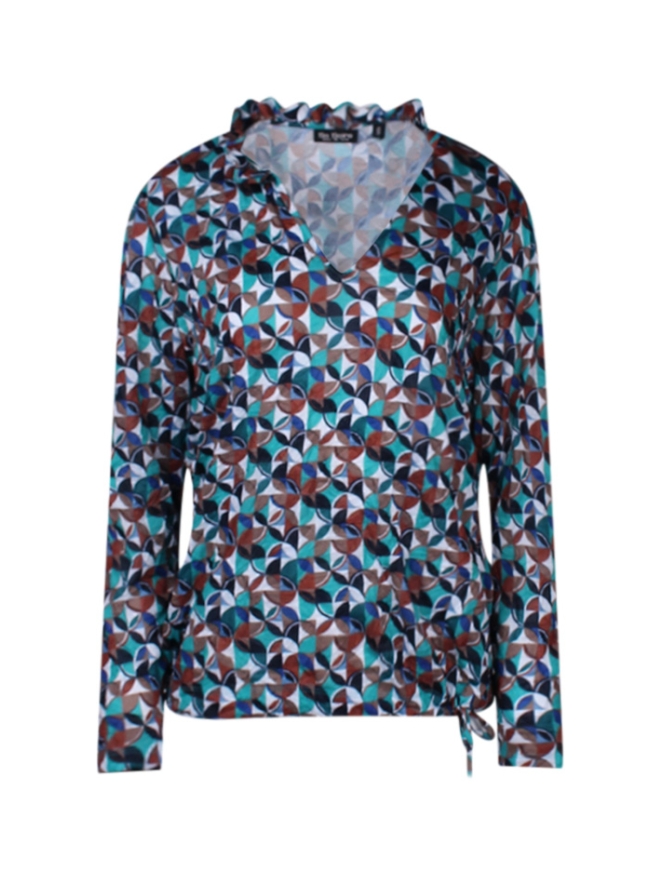 Top met grafisch dessin, met v-hals en ruche rond de nek. Aan de onderkant kunt u de top met een koord strakker of losser maken.