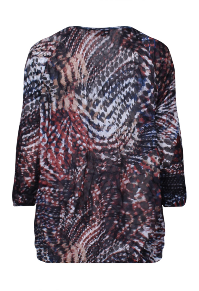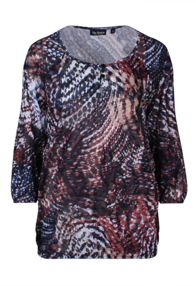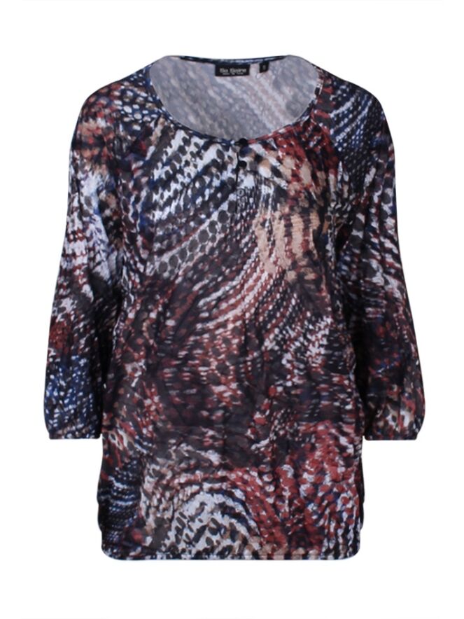 Damestop met aquarelprint en driekwart mouwen met elastiek aan de uiteinden. De hals is voorzien van drie knoopjes die je kunt openen voor een variabele look. De top sluit mooi aan dankzij het elastiek in de zoom aan de onderkant.