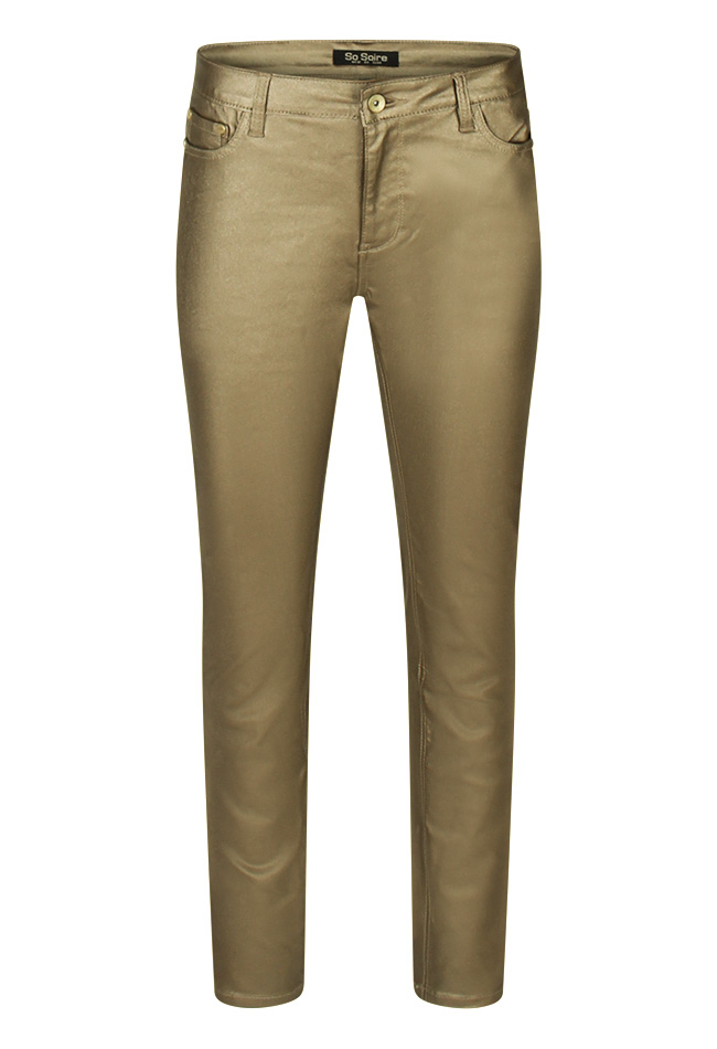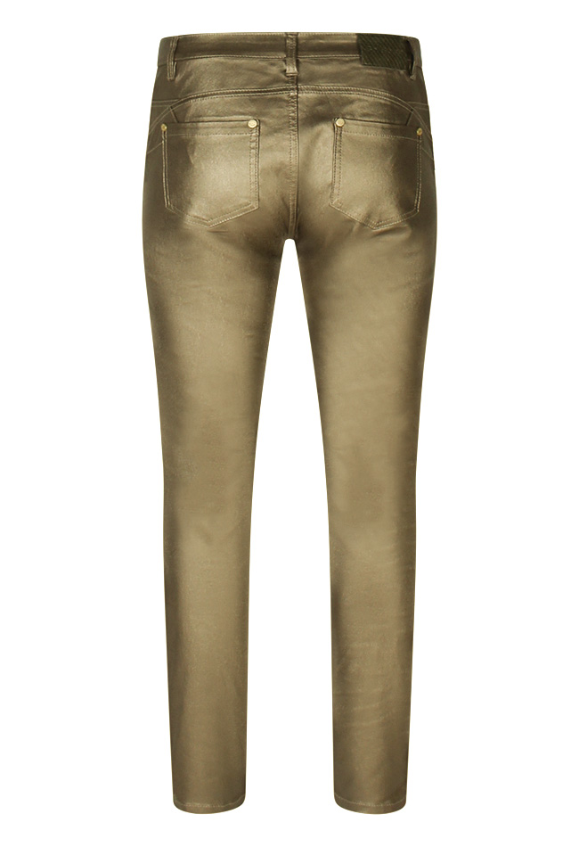 Fraaie broek met een PU coating in zwart, taupe of brons. Deze broek is een 5-pocket model en heeft een push up fit. Zit comfortabel door de superstretch formule. Combineer het met een top of trui en laat de kleuren speels terugkomen voor een extra matchende outfit.