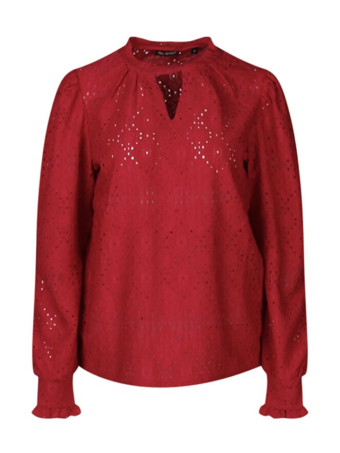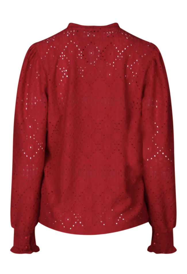 Deze dames top met lange mouwen is gemaakt van ajour jersey en heeft een V-splitje bij de hals. De pofmouwen geven het een subtiel en elegant detail.
