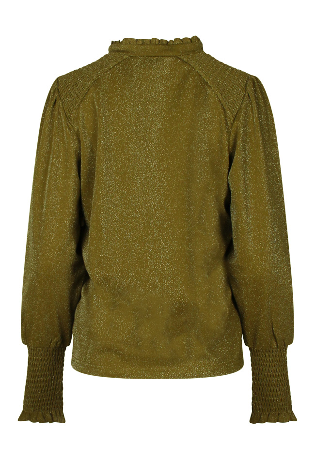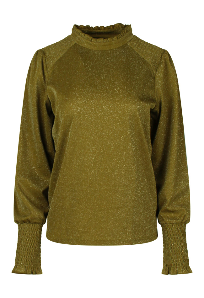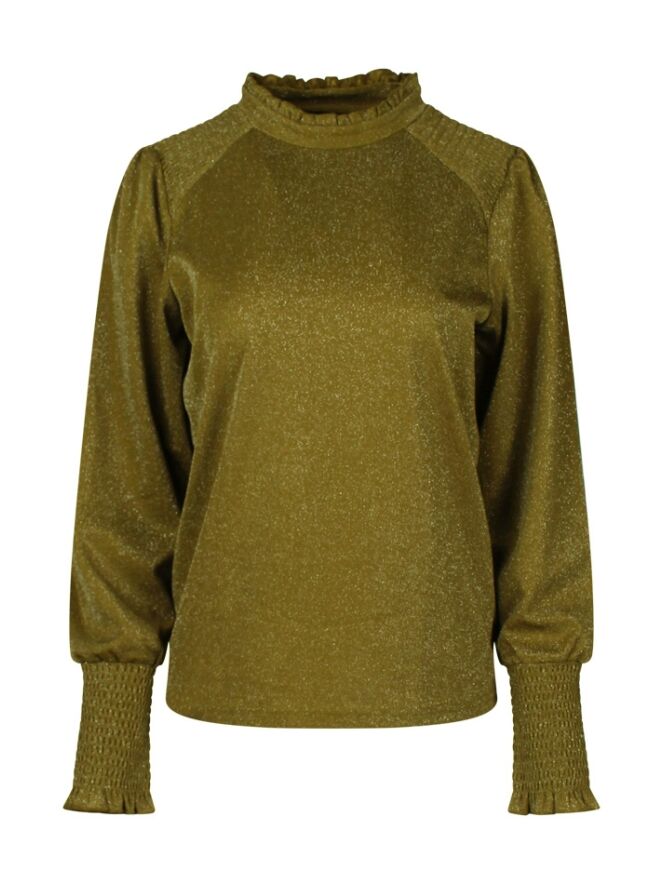 Dames glitter top met col waar een ruches aan zit, de manchet is gemaakt van smockwerk en heeft aan het einde een korte ruche.