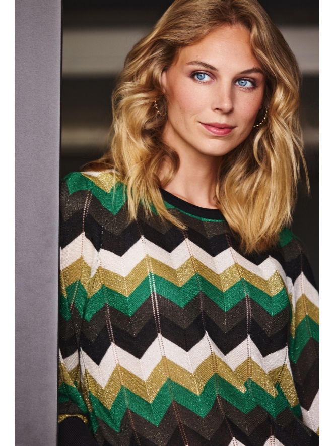 Top met zigzag design, de stof zit een lurexdraad waardoor de top is voorzien van glitters.