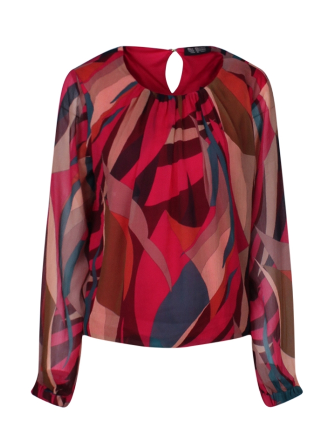 Deze luxe multicolor top is dubbelwandig. De bovenstof is van chiffon en geeft het geheel een sjiecke uitstraling. De mouwen zijn echter niet dubbelwandig en zijn volledig van chiffon en hierdoor ook iets doorschijnend. Achter op de hals zit een kleine druppel uitsparing welke gesloten wordt met een knoopje. Casual look? Combineer het met een fijne jeans. Ga je voor netjes en sjieck? Draag het dan op een pantalon met een hakje.