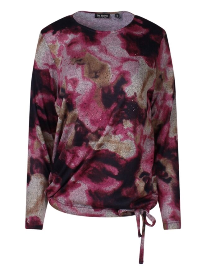 Deze fijngebreide dames trui heeft een vlek- en tekstdessin met strassdetails. De boord is voorzien van een koord dat gestrikt kan worden voor een gepersonaliseerde pasvorm.