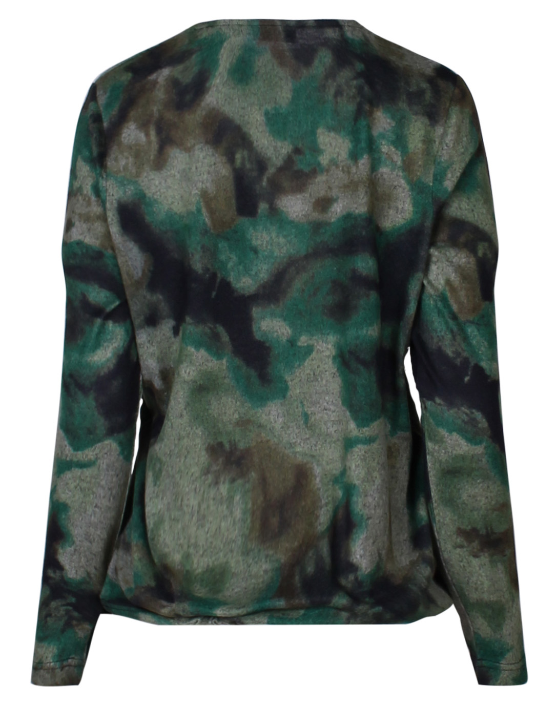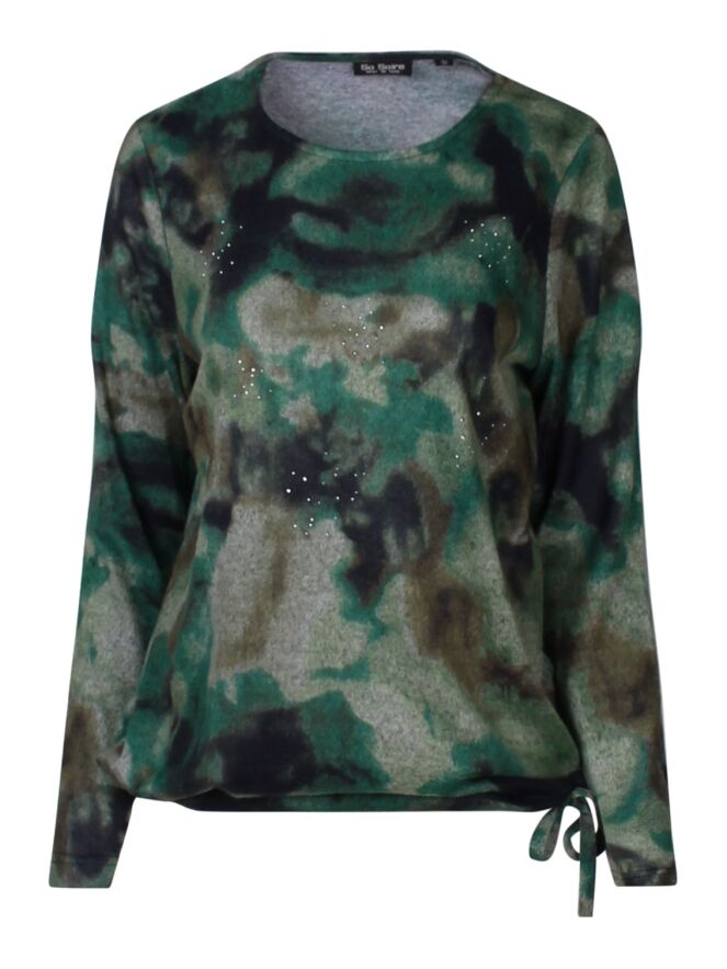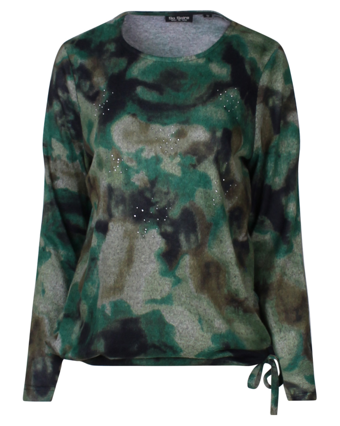 Deze fijngebreide dames trui heeft een vlek- en tekstdessin met strassdetails. De boord is voorzien van een koord dat gestrikt kan worden voor een gepersonaliseerde pasvorm.