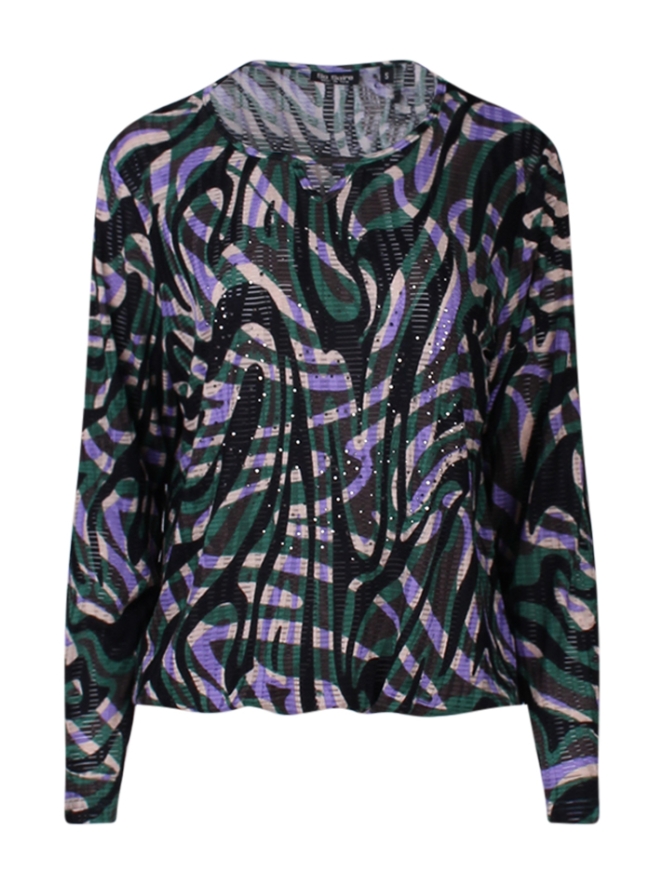 Deze elegante dames top met lange mouwen is gemaakt van luxe jacquard stof en heeft een verfijnd golvend streep dessin. Het strass op het voorpand voegt een sprankelende touch toe. Het elastiek onder in de boord zorgt voor een perfecte pasvorm. Combineer met een stijlvolle broek of rok voor een elegante en modieuze look.