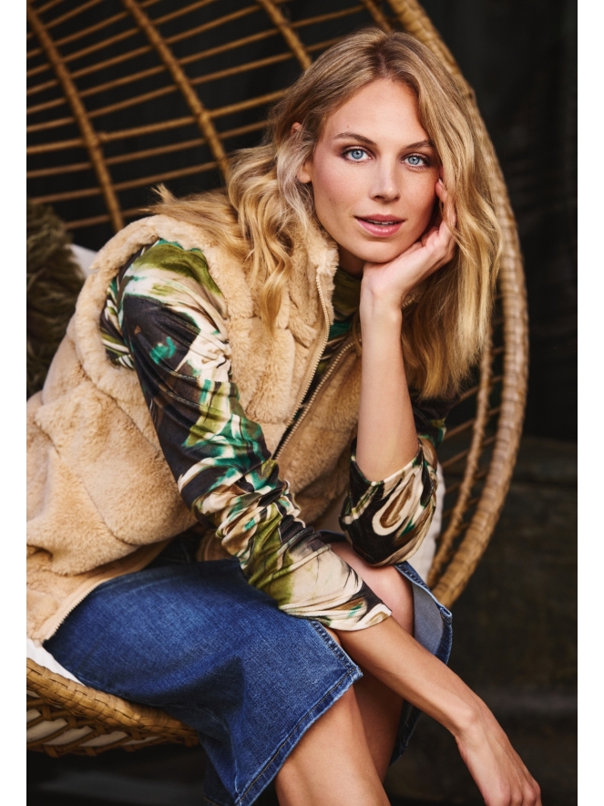 Deze dames top met lange mouwen is gemaakt van zachte velours en heeft een marmerdessin. Voorzien van een col voor extra warmte en een stijlvolle uitstraling.