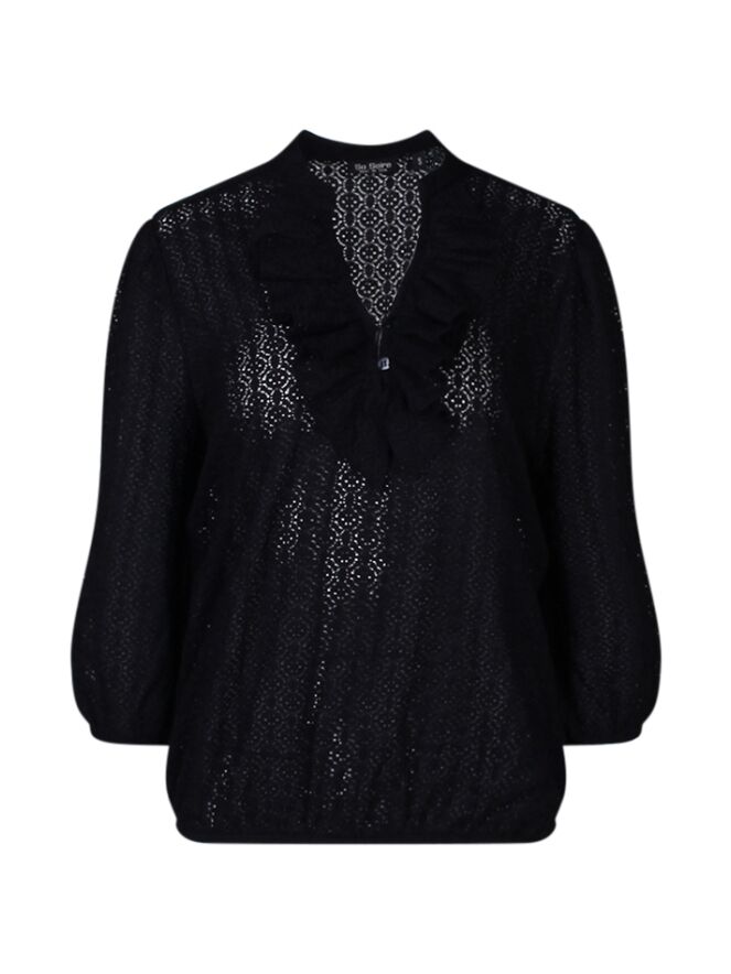 Blouse van een mooie ajour stof, rond de hals lijn heeft de blouse een mooie ruche.