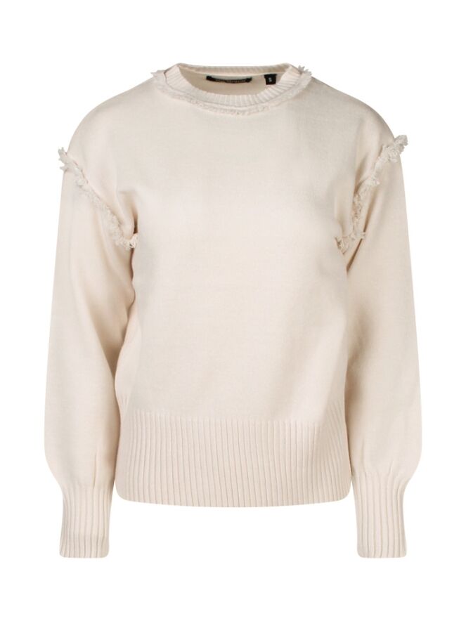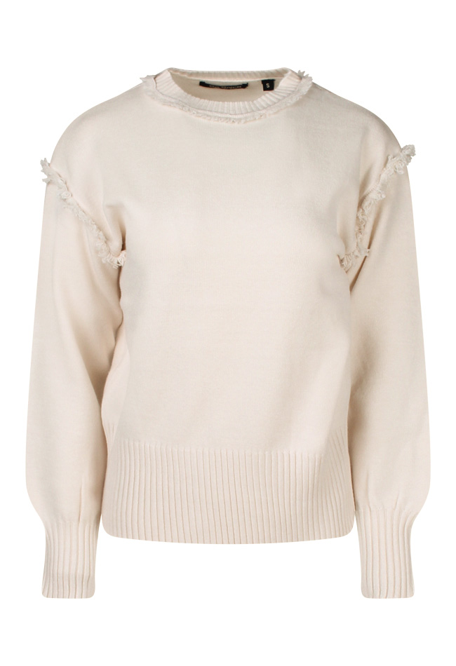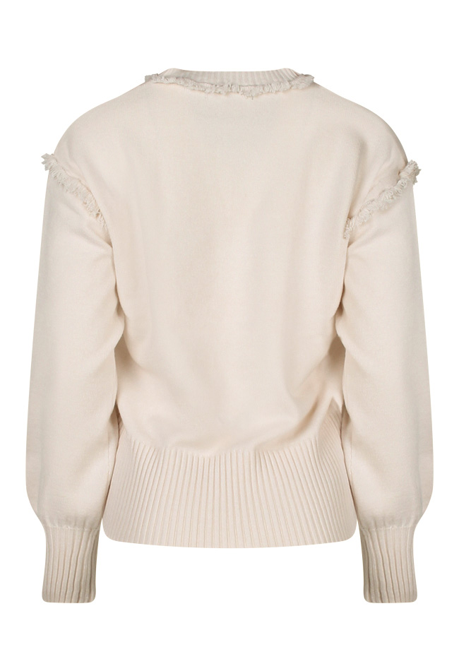 Deze dames trui heeft rond de hals en mouw inzet een rand met rafeltjes. Leuk! Net even wat anders! Te combineren bij iedere broek. Super makkelijk dus en comfortabel.