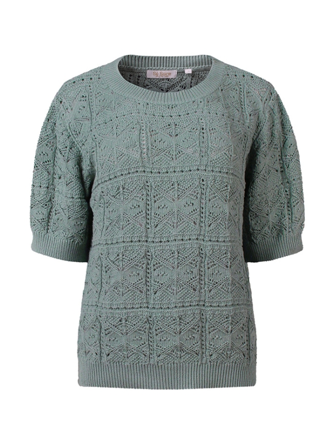 Fraaie zomerse trui met een ajourpatroon. Door het ajourmotief is de trui doorschijnend. We adviseren daarom om er een hemdje of singlet onder te dragen.
