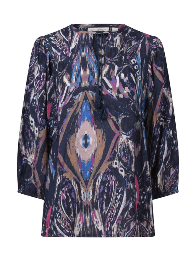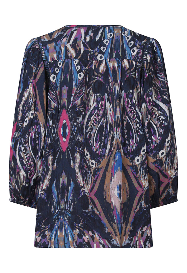 Damestop van rayon crêpe met halflange (3/4) mouwen, een kleine V-hals met koordje en kwastjes. De top heeft een opengewerkte bies langs de mouwen en elastiek bij de mouwboordjes. Uitgevoerd in een multicolor pauwenoogprint met een speels vegendessin.