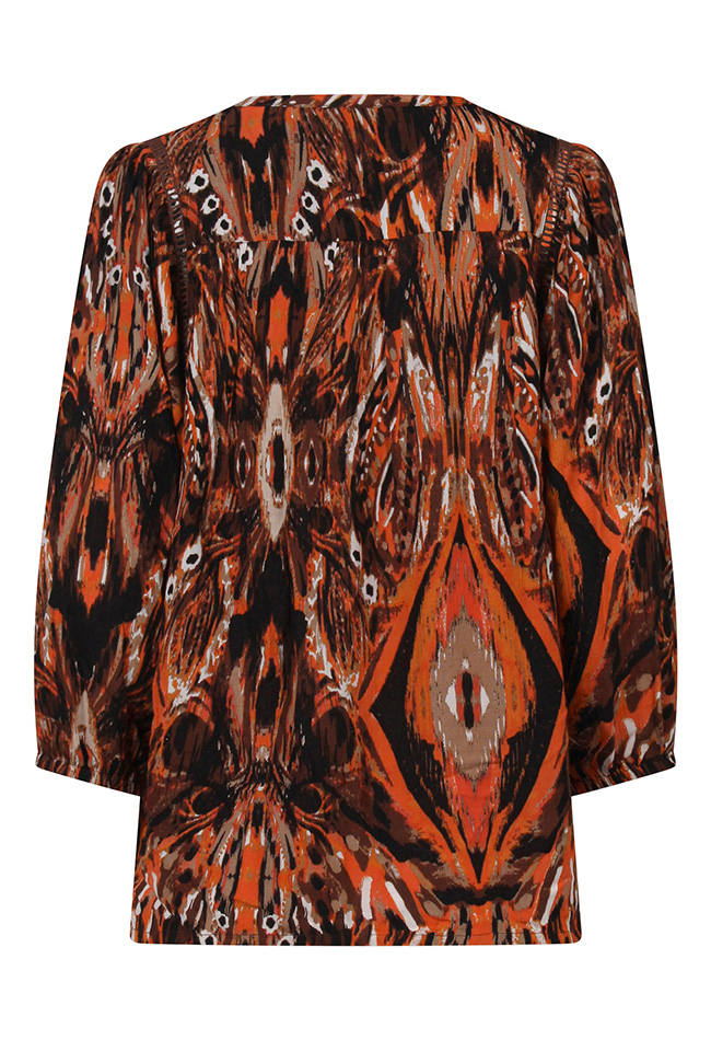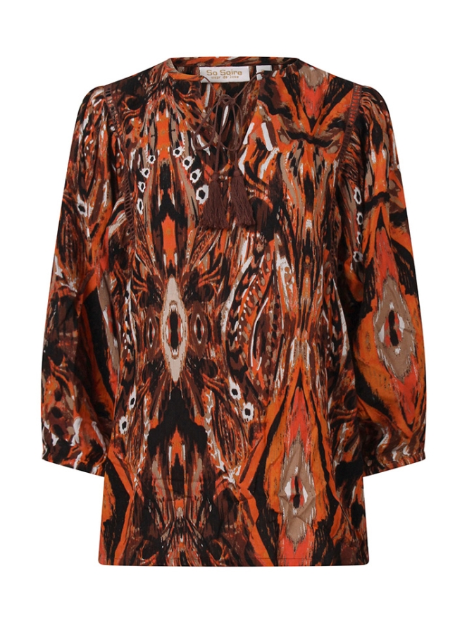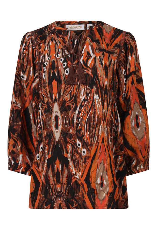 Damestop van rayon crêpe met halflange (3/4) mouwen, een kleine V-hals met koordje en kwastjes. De top heeft een opengewerkte bies langs de mouwen en elastiek bij de mouwboordjes. Uitgevoerd in een multicolor pauwenoogprint met een speels vegendessin.