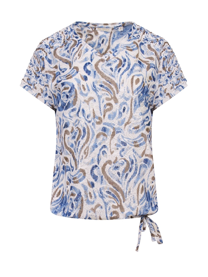 Deze dames top combineert comfort met een vrouwelijke uitstraling. De elegante V-hals zorgt voor een flatterend silhouet, terwijl het koordje in de taille de top mooi laat aansluiten en je figuur subtiel benadrukt. De smockband op de schouders geeft een speels en stijlvol detail, waardoor de top net dat beetje extra krijgt.