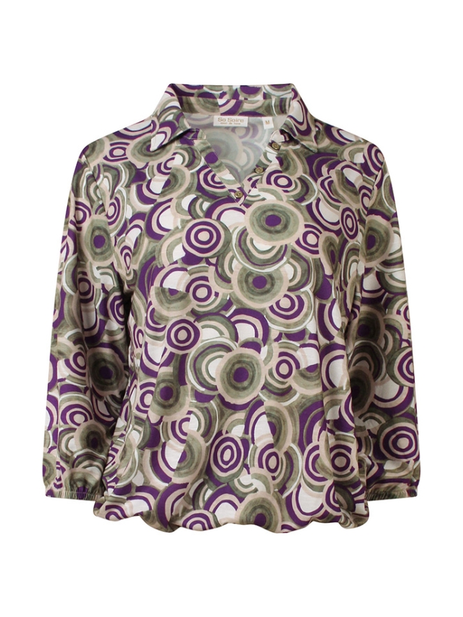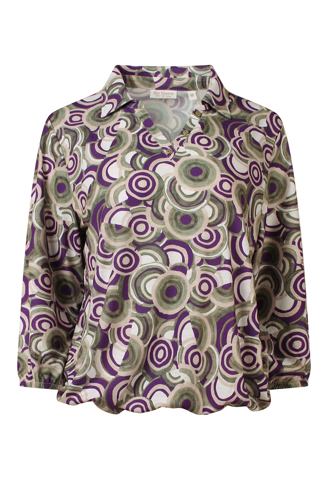 Deze stijlvolle dames top combineert comfort met een speelse uitstraling. De top is uitgevoerd met elegante 3/4 mouwen, waardoor hij perfect is voor zowel het voor- als najaar. De V-hals met subtiel polokraagje geeft het ontwerp een vrouwelijke en tegelijkertijd sportieve touch. Dankzij het elastiek in de taille valt de top mooi aangesloten en wordt het silhouet op een flatterende manier geaccentueerd.
