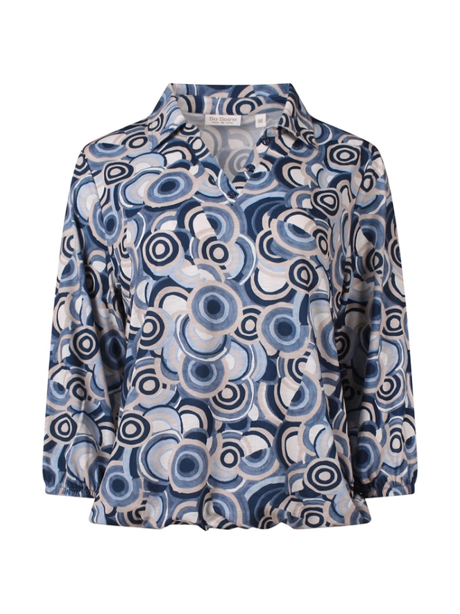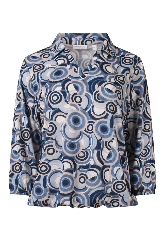Deze stijlvolle dames top combineert comfort met een speelse uitstraling. De top is uitgevoerd met elegante 3/4 mouwen, waardoor hij perfect is voor zowel het voor- als najaar. De V-hals met subtiel polokraagje geeft het ontwerp een vrouwelijke en tegelijkertijd sportieve touch. Dankzij het elastiek in de taille valt de top mooi aangesloten en wordt het silhouet op een flatterende manier geaccentueerd.