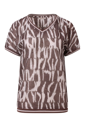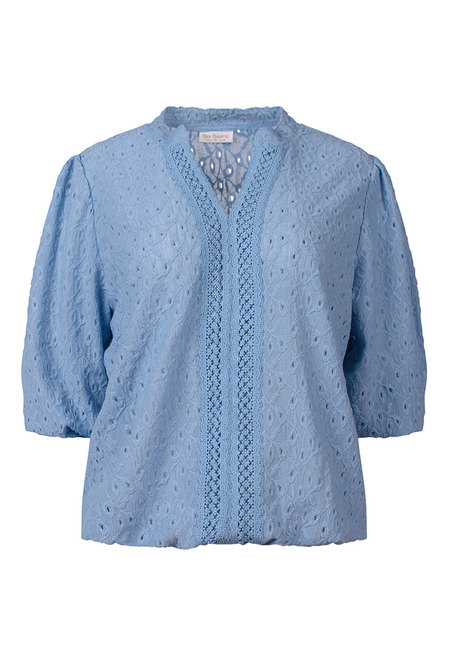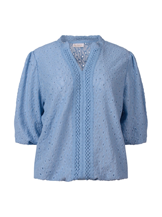 Deze elegante dames top van ajour stof geeft je outfit een luchtige en vrouwelijke uitstraling. De top heeft een flatterende V-hals die het decolleté mooi accentueert en zorgt voor een stijlvolle look. Dankzij het elastiek in de taille sluit de top mooi aan en ontstaat er een speels bloezend effect.