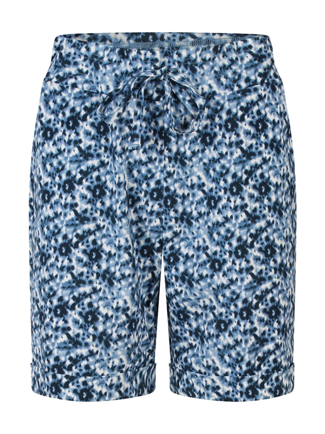 Comfortabele dames korte broek van een soepele polyamide-elastaan travelkwaliteit, die licht, ademend en kreukvrij is. Het speelse vlekjesdessin geeft de short een moderne en frisse uitstraling. De omslag aan de pijpen zorgt voor een casual detail, terwijl het koordje in de taille een verstelbare en fijne pasvorm biedt.