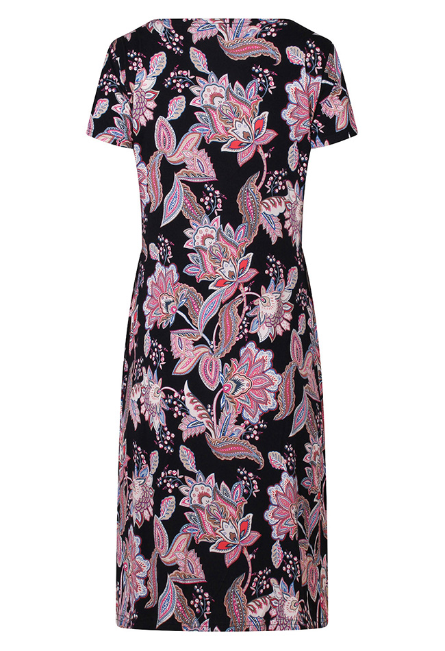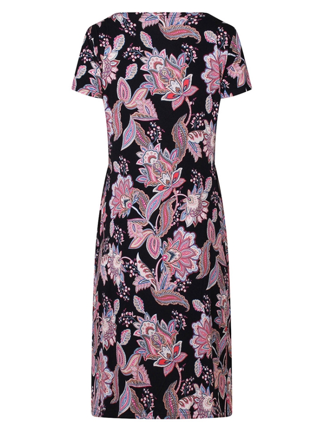 Elegante damesjurk met overslag en een flatterende V-hals voor een vrouwelijke en stijlvolle uitstraling. Gemaakt van een comfortabele viscose-elastaan mix die soepel valt en prettig meebeweegt. Het bloemdessin geeft de jurk een frisse en romantische look. Perfect voor zowel alledaagse momenten als speciale gelegenheden en eenvoudig te combineren met sandalen of hakken voor een complete outfit.