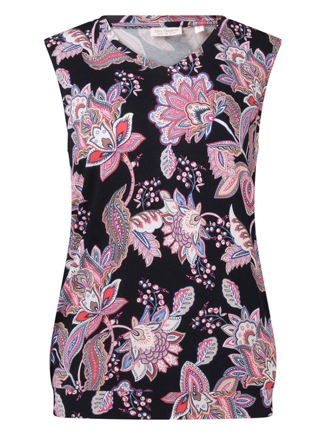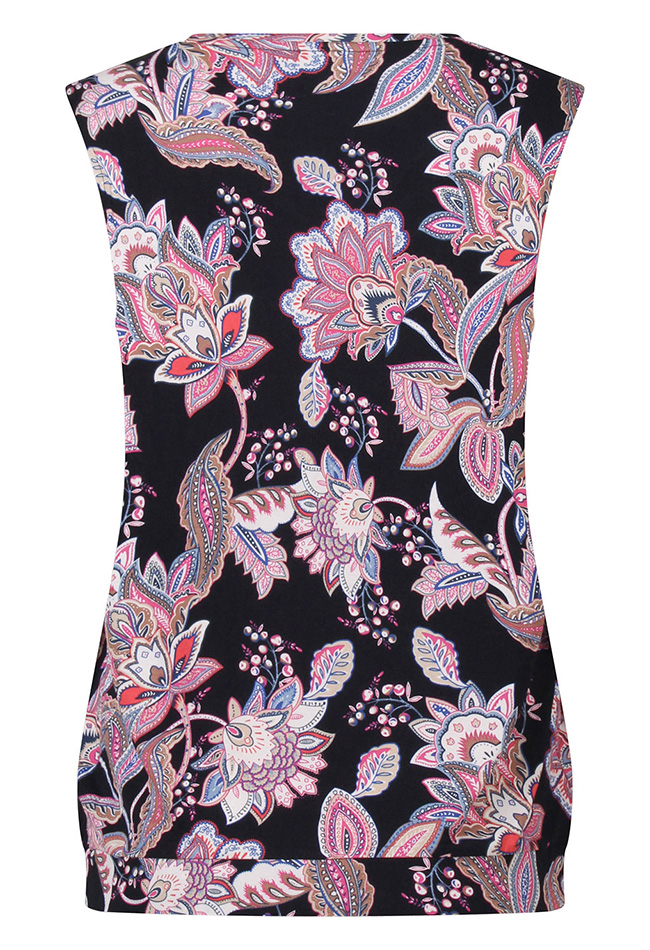 Dames singlet met een vrouwelijke V-hals en mouwloos ontwerp, uitgevoerd in een elegant paisley bloemdessin. Afgewerkt met een band onderaan de body voor een comfortabele en flatterende pasvorm.