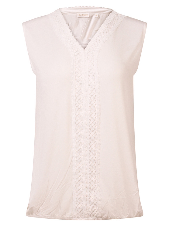 Dames top, mouwloos, met een elegante lace afwerking bij de hals en het voorpand. Voorzien van elastiek onderaan voor een comfortabele en flatterende pasvorm.