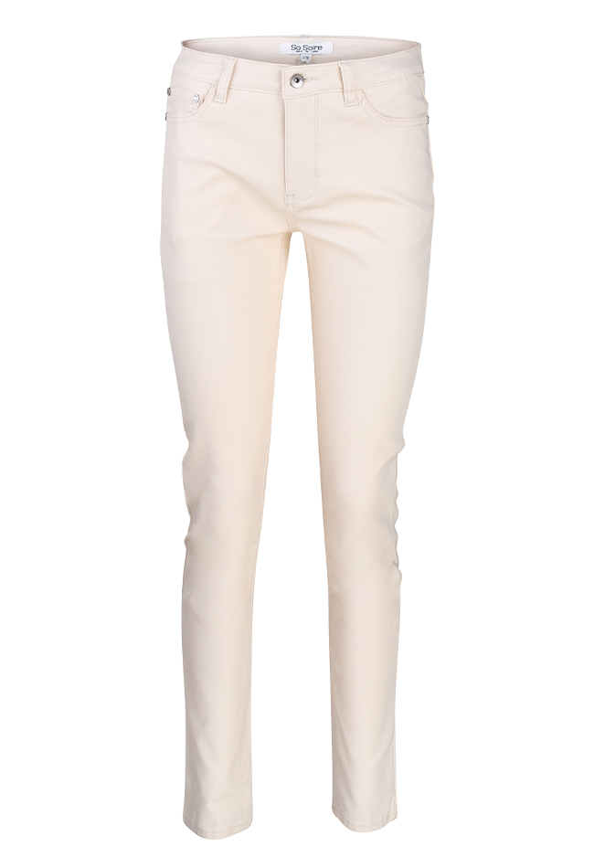 Coated broek van So Soire. De broek heeft een rechte skinny fit. De broek heeft een coated laagje. Valt op maat. Materiaal: 63% katoen, 35% polyester, 2% elasthan. Wassen op 30 graden, niet bleken, niet in de droger, kan gestreken worden.