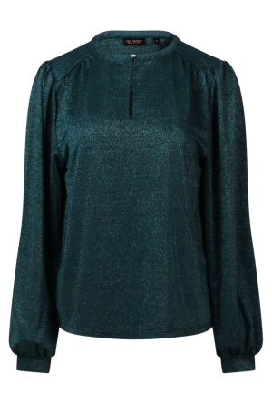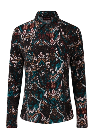 Blouse van So Soire. De blouse heeft lange mouwen en een all over print. De blouse heeft een bies op de schouders en een ruche hals met een peep-hole en strikje. Valt groot. Materiaal: 100% polyester, 30 graden wassen, niet bleken, niet in de droger, kan gestreken worden.