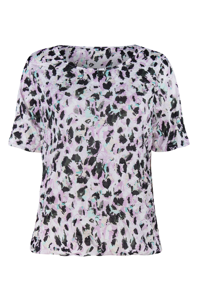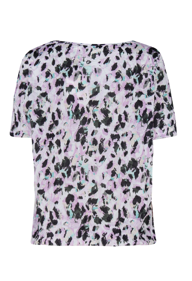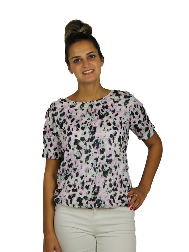 Crushed t-shirt van So Soire. Het t-shirt heeft een gekreukeld effect en een all over print. Er zit elastiek in de onderkant van het t-shirt. Valt groot. Materiaal: 100% polyester, 30 graden wassen, niet bleken, niet in de droger, niet strijken.