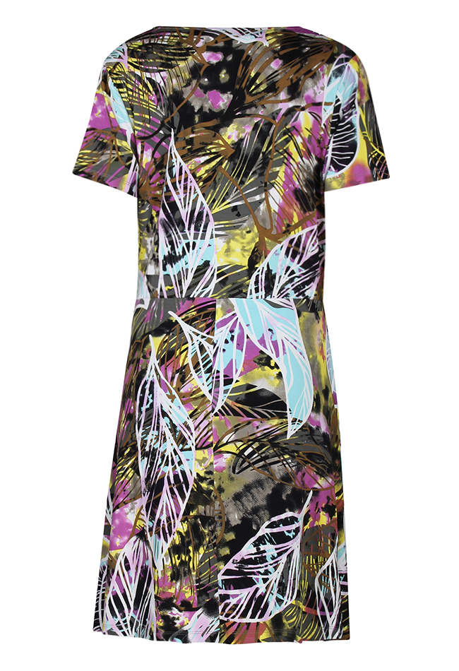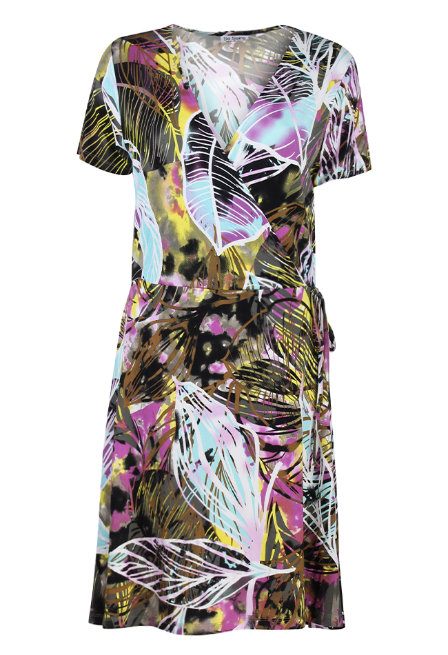 Jurk van So Soire. De jurk heeft een blader/bloem design. De top heeft een overslag look, er zit een sier strikje in de taille. Valt op maat. Materiaal: 95% viscose, 5% elasthan. Wassen op 30 graden, niet bleken, niet in de droger, kan gestreken worden.