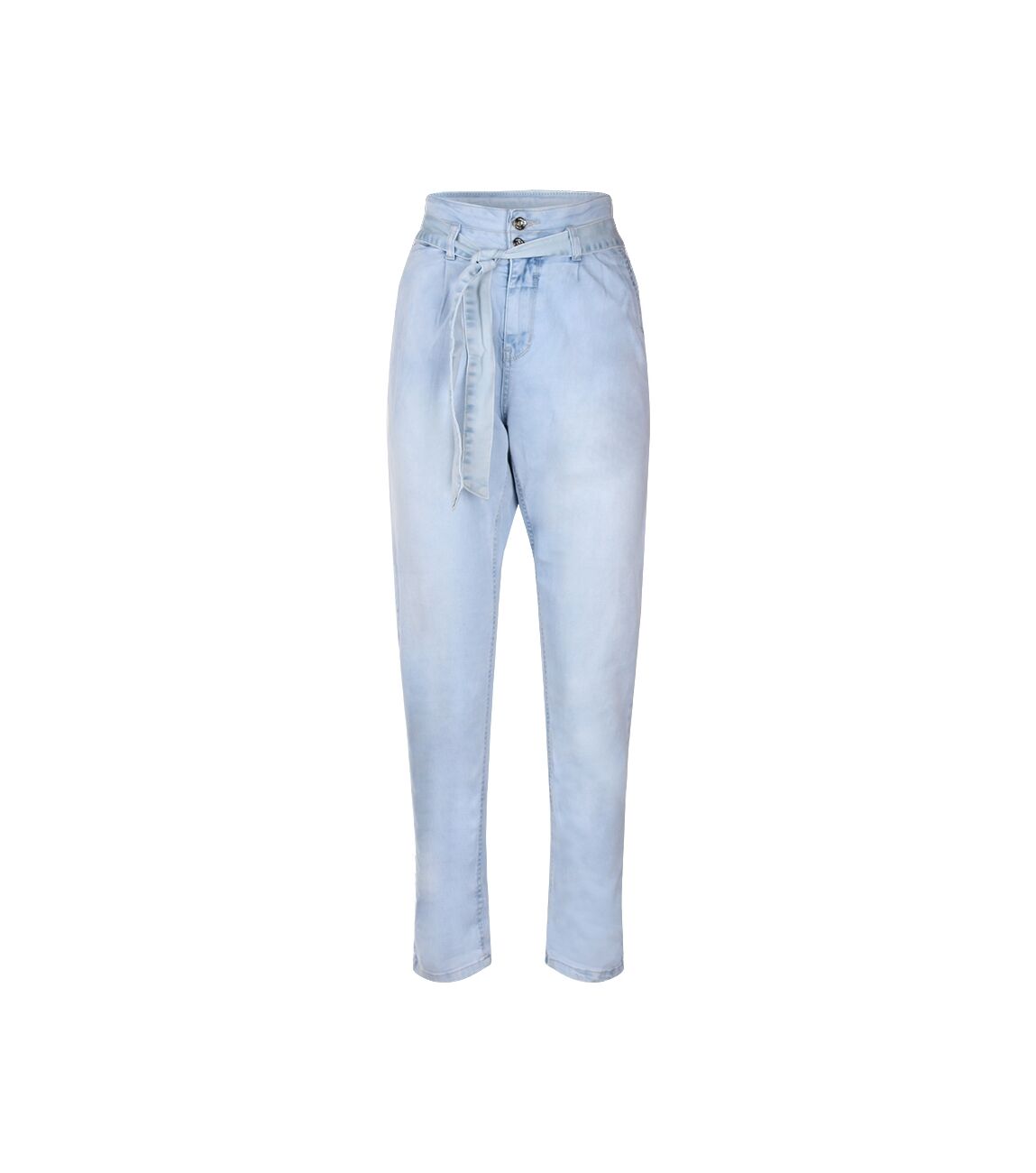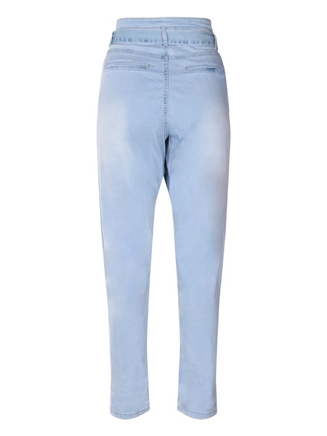 Deze jeans heeft een elastische taille met een strik ceintuur. De broek heeft een twee knoop-rits sluiting en aan de voorkant steekzakken. Onder de tailleband zit een bandplooi en op de achterkant van de broek zitten twee nep paspel zakken.