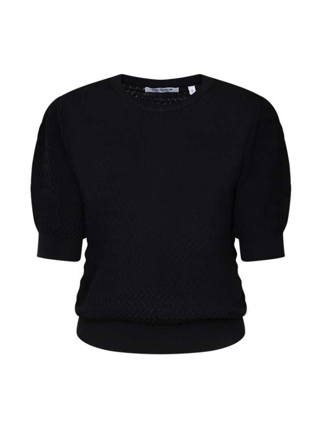 Dit ajour gebreide truitje heeft een korte pofmouw en ronde hals. Door het ajour visgraat motief draagt hij heerlijk licht. Het truitje is beschikbaar in drie verschillende kleuren.