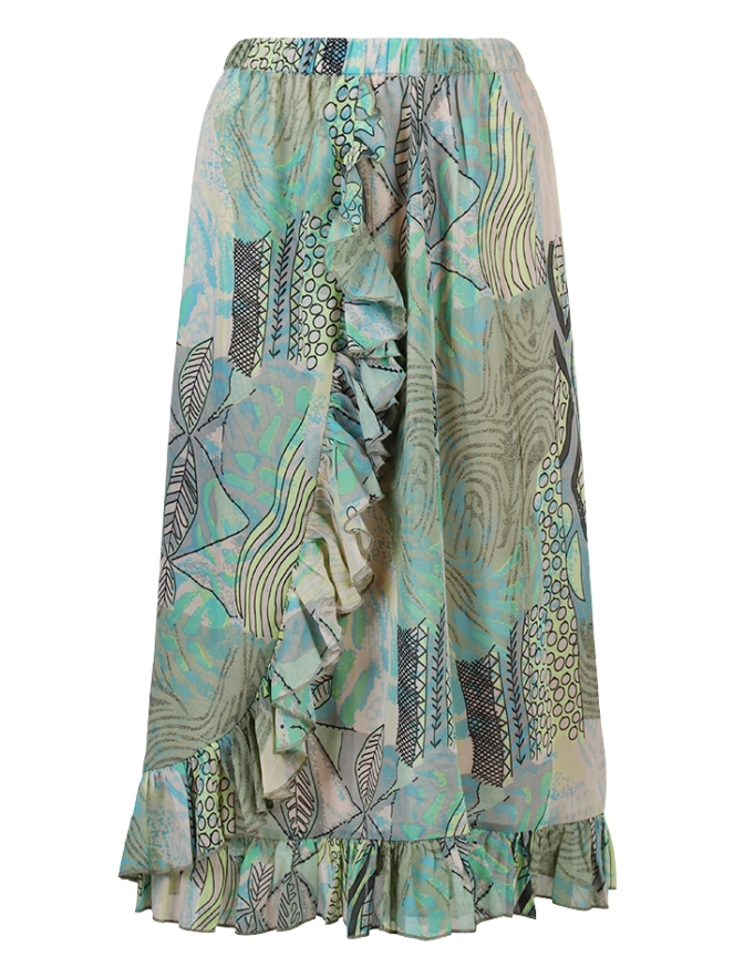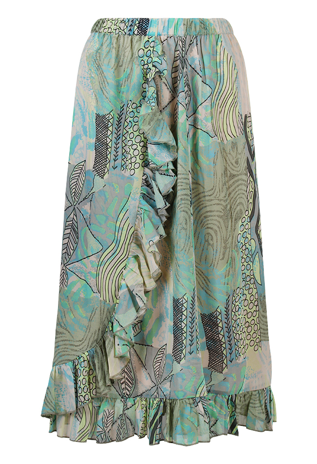Rok Jody van So Soire met elastische tailleband. Deze midi rok heeft een fake overslag en heeft franje aan de onderkant oplopend naar boven.
