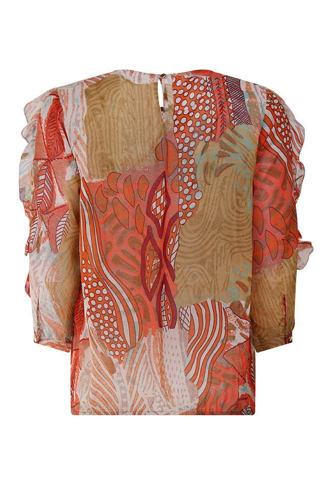 Top met 4/3 mouw en ruche aan de voorkant. In de nek zit een kleine sluitknoop. De taille heeft een elastiekenband.