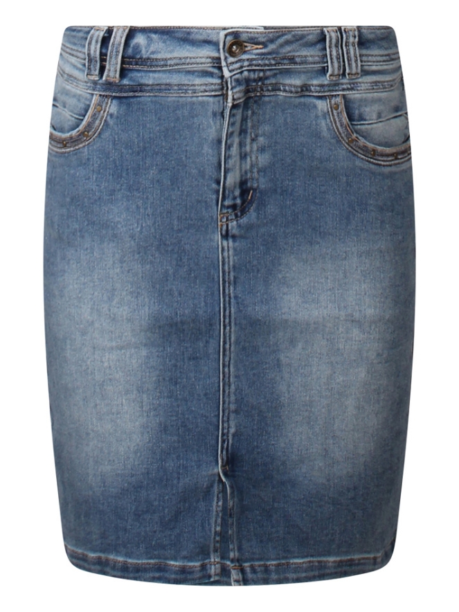 Deze denim rok heeft een klein splitje voor en een paar studs bij alleen de voorste twee zakken. Dit model valt boven de knie.