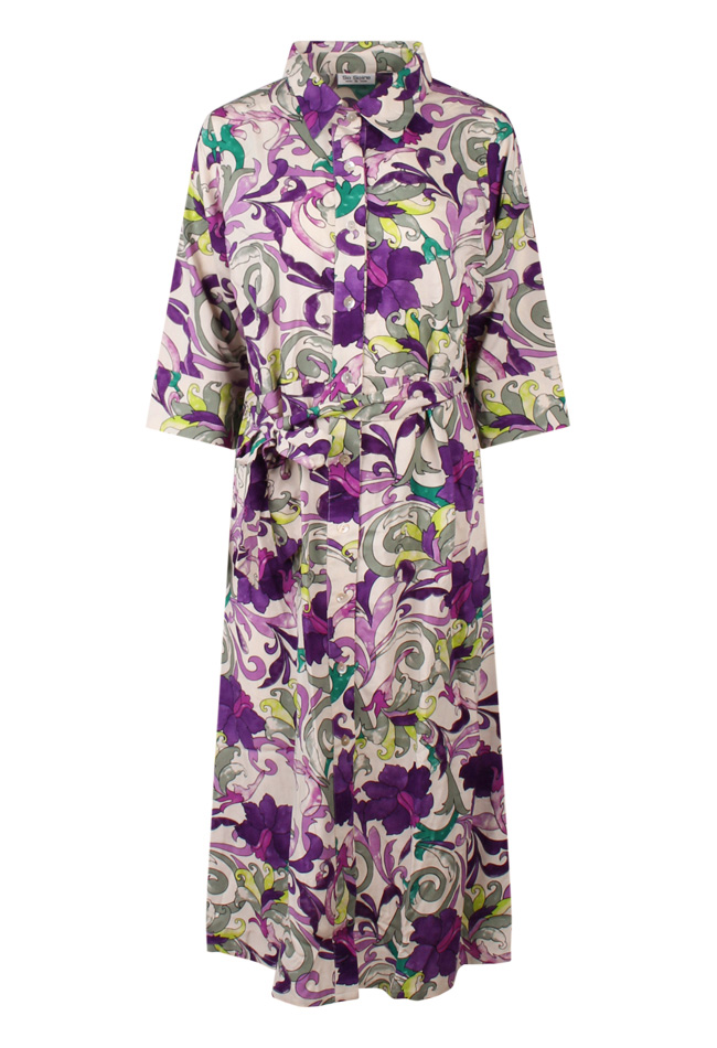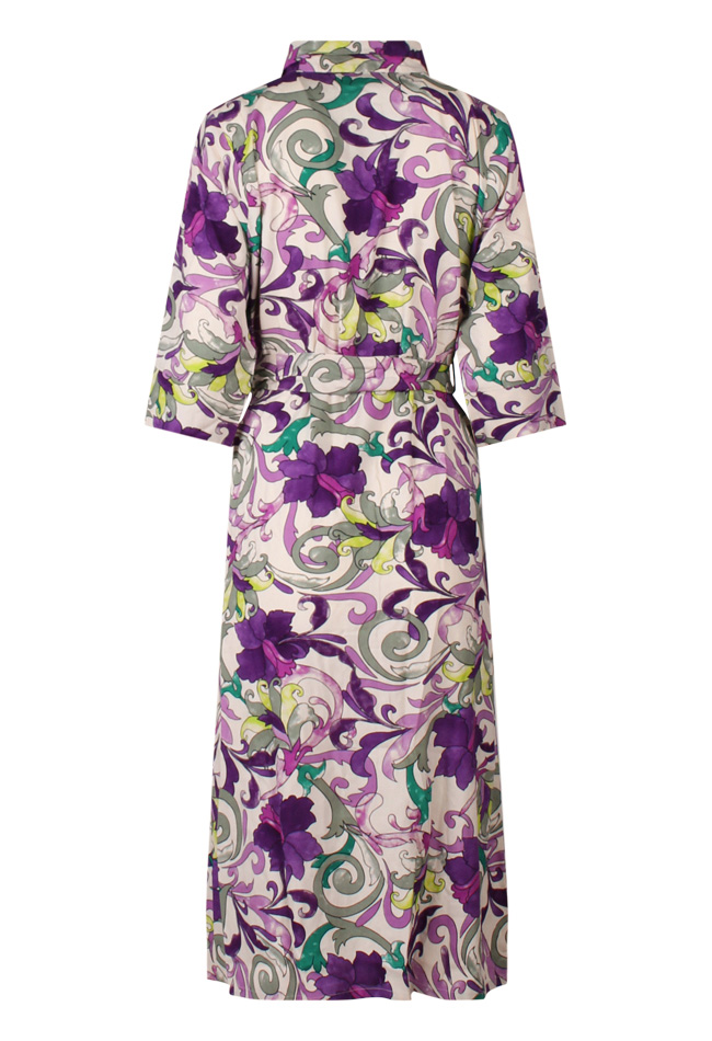 Deze lange jurk is een doorknoop model met polo kraagje en mouwen tot de elleboog. In de middel zit een ceintuur.