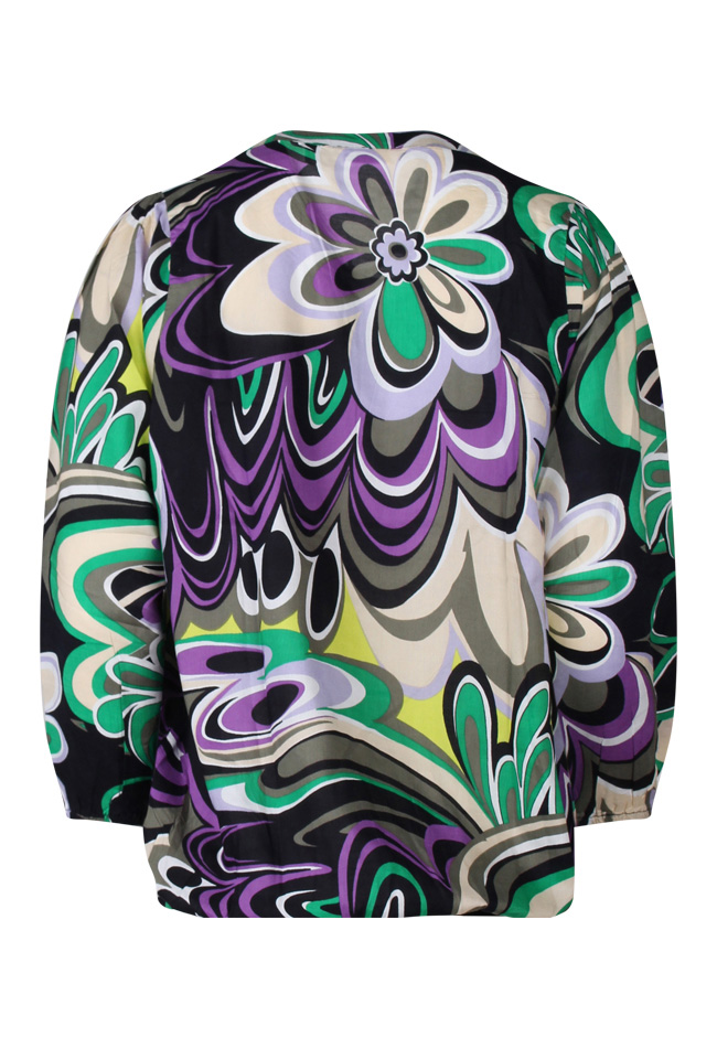 Deze top heeft een ronde hals met druppel uitsparing aan de voorkant en sierkoord. Zowel aan het uiteinde van de driekwart mouwen als aan de onderkant van deze top zit elastiek.