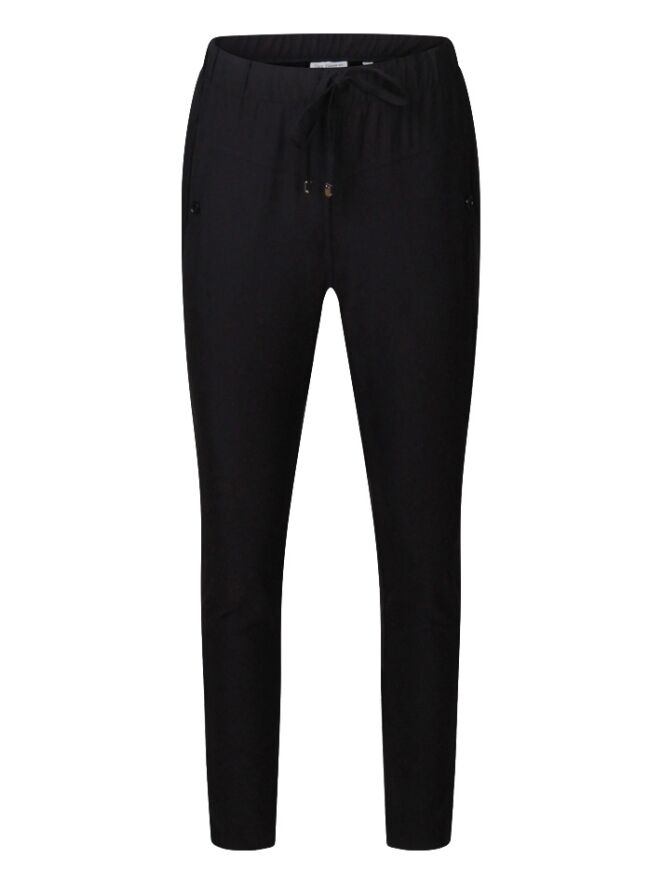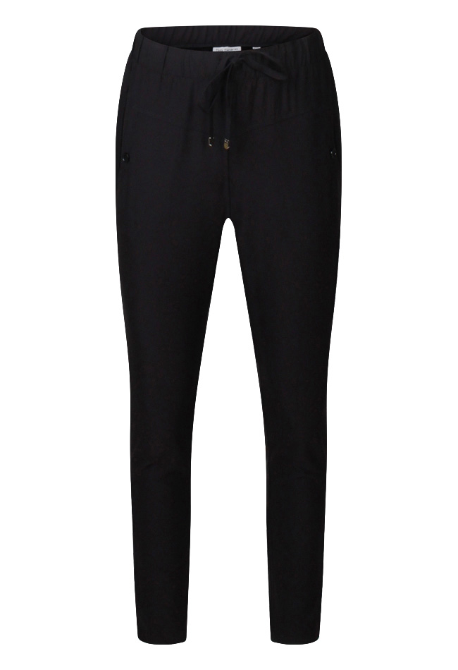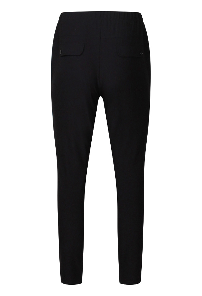 Deze nette pantalon van travel stof heeft een elastische tailleband met sierkoord, twee steekzakken met knoop en twee sierzakken achterop.