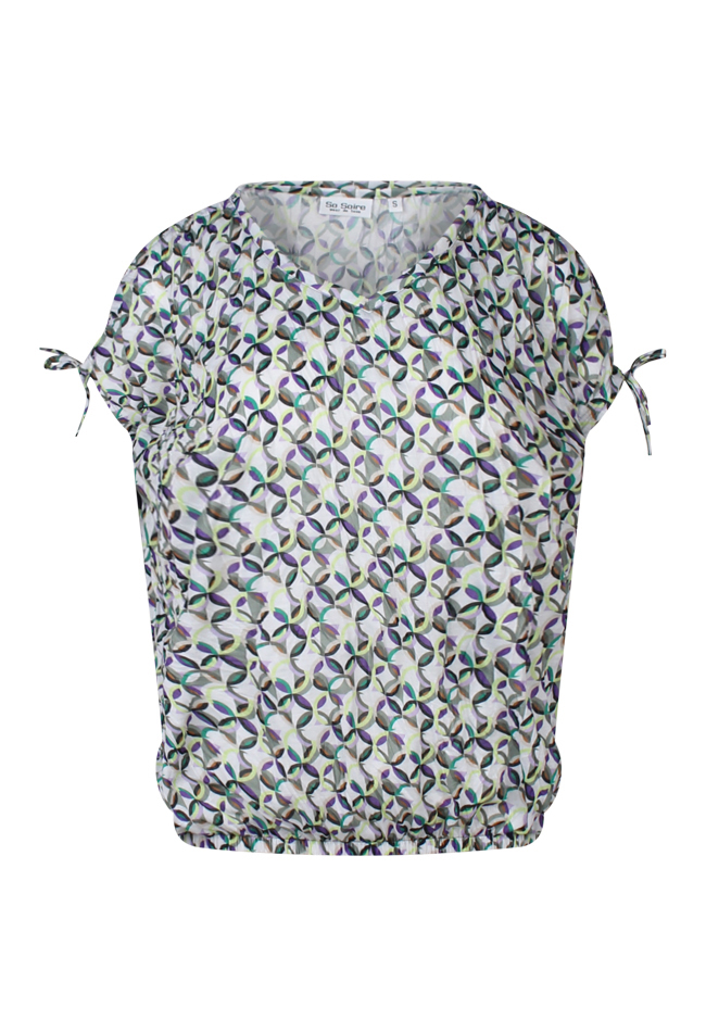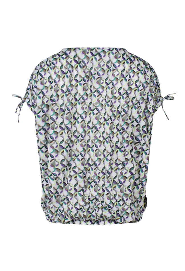 Deze top met cirkelvormige print heeft een lage V hals met een elastiek onder in de taille om het shirt te laten bollen. Over de schouder loopt een koordje welke bij aanspannen de mouw inkort.
