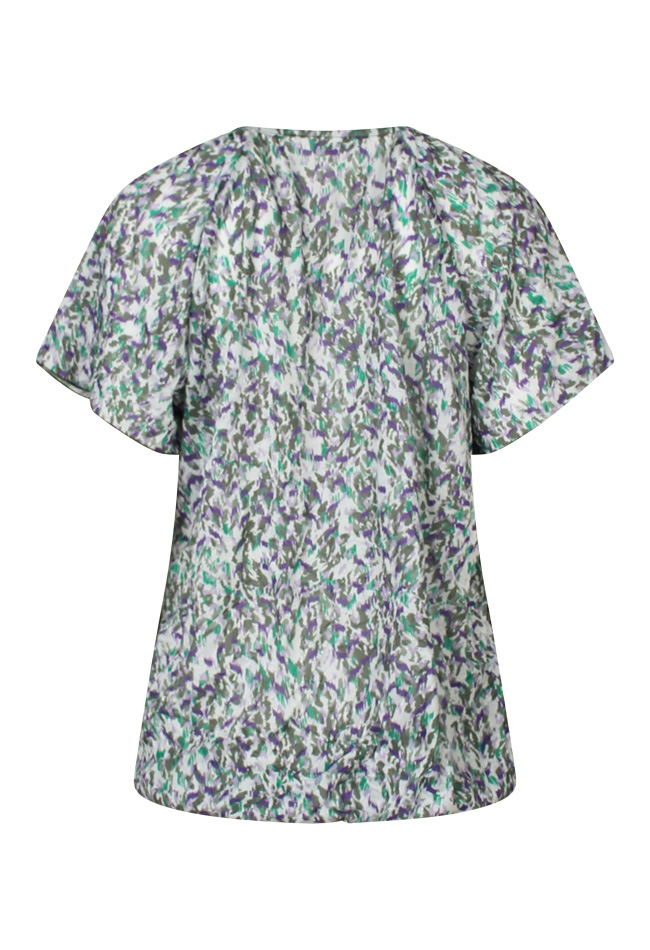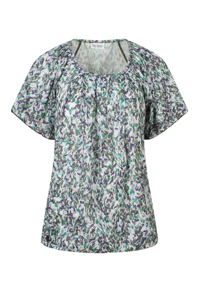 Deze top met vlindermouw heeft een elastiek onder in de taille welke het shirt laat bollen.