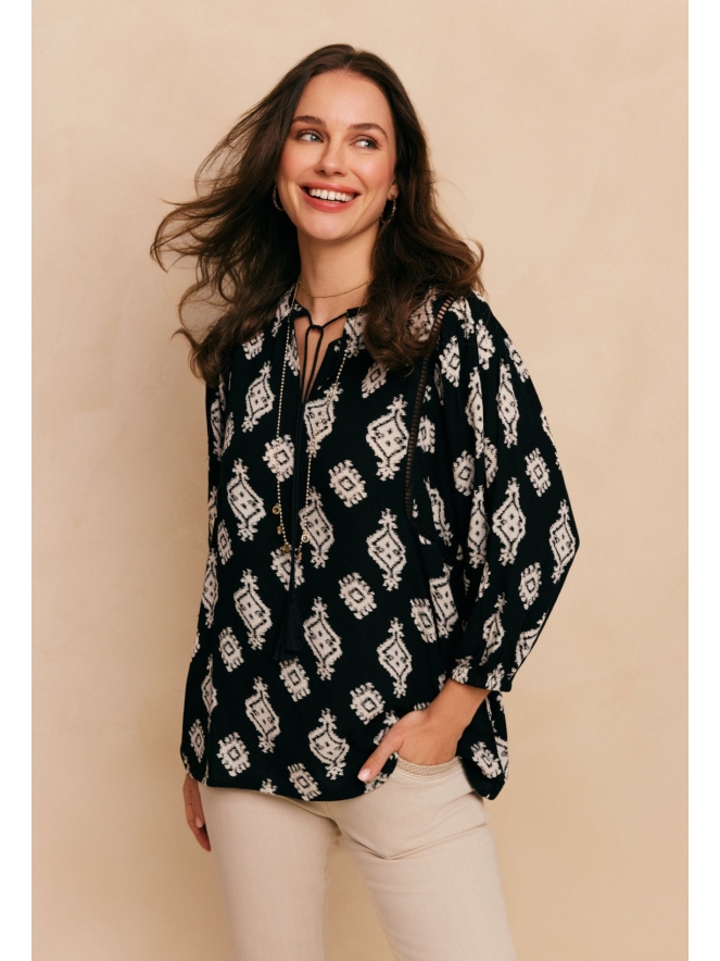 Prachtige top in neutrale kleuren en dus een all time favourite voor mooie dagen! Van 100% viscose en draagt daardoor heerlijk en is tevens ontzettend ademend waardoor het aanvoelt als linnen. Met een driekwart mouw en een koordje voor bij de hals ben jij vrij om deze top te dragen zoals jij wil! We love it!