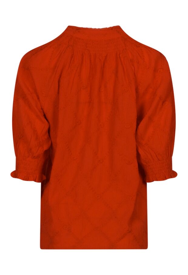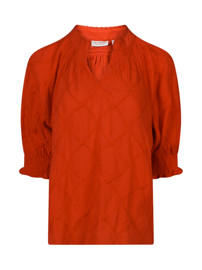 Deze luchtige dames top van So Soire uit de zomercollectie valt op door de geborduurde ruit met subtiele bloemen, wat zorgt voor een charmante en vrouwelijke uitstraling. De V-hals en gesmockte details rond de hals en onder aan de korte raglanmouwen geven de top een verfijnde afwerking. Gemaakt van lichtgewicht polyester en perfect te combineren met een jeans, rok of short voor een stijlvolle zomerse look.
