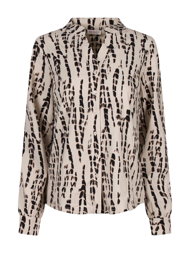Mooie blouse met aanwezig design van travel stof. Dit doorknoopmodel met V-hals heeft een kleine schoudervulling en lange mouwen. Hou je er van om een compleet pak te dragen? Dan hebben we ook een bijpassende travel broek voor je onder art.nr. Z90607