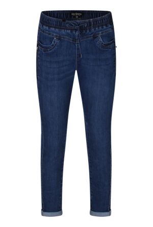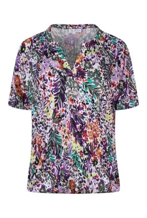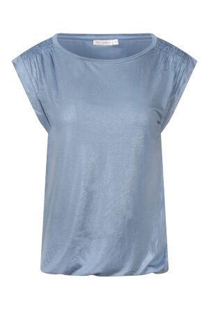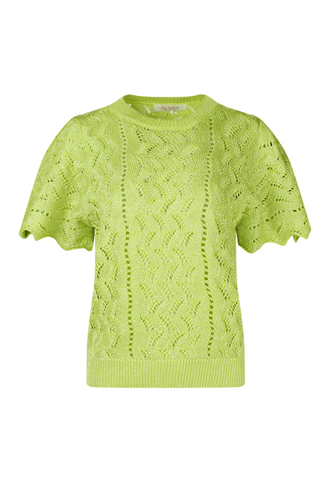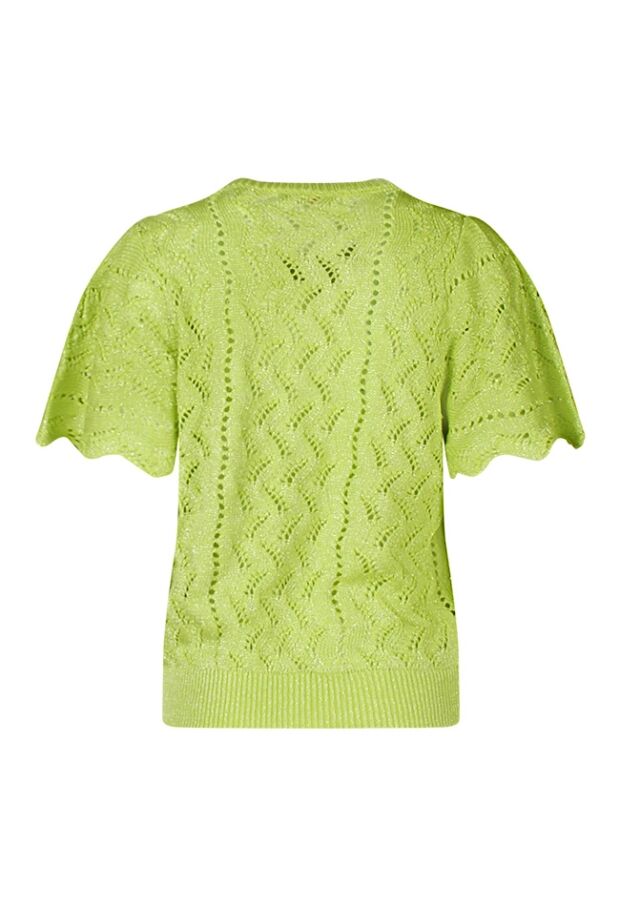 Zomerse trui met open haak/ajour motief, mede hierdoor adviseren we om er een hemdje onder te dragen. In het garen zit een klein glimmertje. Deze trui heeft een korte mouw met fraaie golvende afwerking. Leuk te combineren met een zomerse rok!