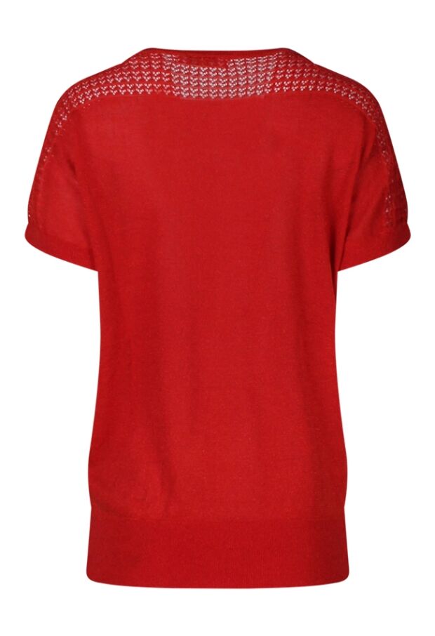 Deze dunne trui met korte mouw heeft een doorschijnend ajour motief op de schouder. Door het garen zit een glitter draad verweven in dezelfde kleur voor een extra twist. Leuk te combineren op een spijkerbroek, korte broek of dreikwart broek!