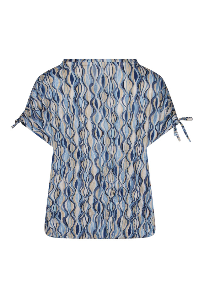 Vrolijke crincle top met meerkleurig design. Deze top heeft een trekkoordje over de schouder zodat je de lengte over de schouder kunt verkorten en een elastiek onder in de middel om het shirt te laten bollen. Leuk op jeans en onder blazers!