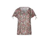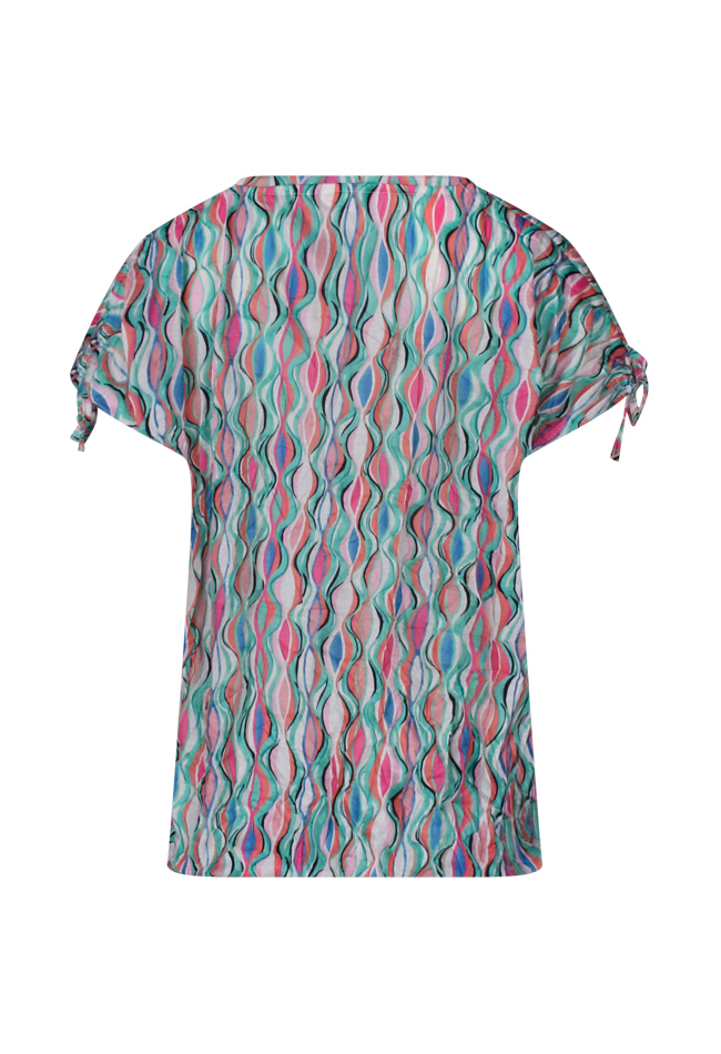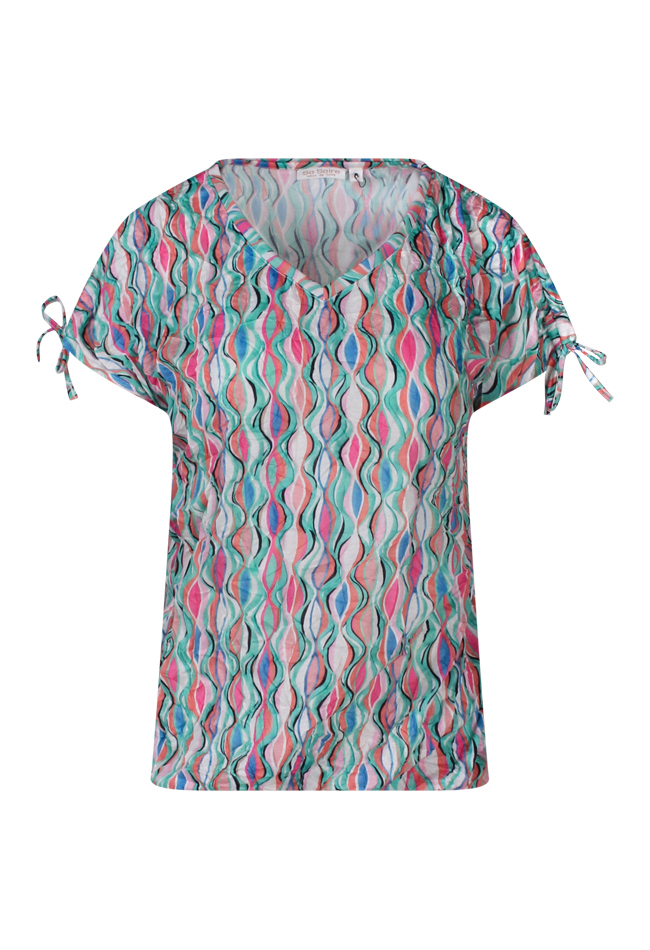 Vrolijke crincle top met meerkleurig design. Deze top heeft een trekkoordje over de schouder zodat je de lengte over de schouder kunt verkorten en een elastiek onder in de middel om het shirt te laten bollen. Leuk op jeans en onder blazers!
