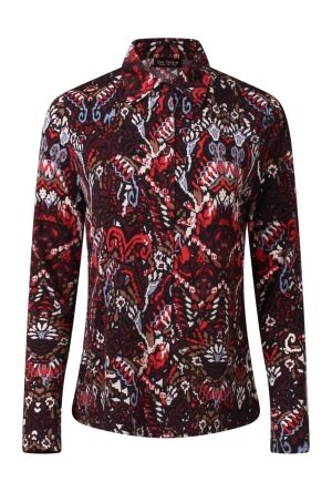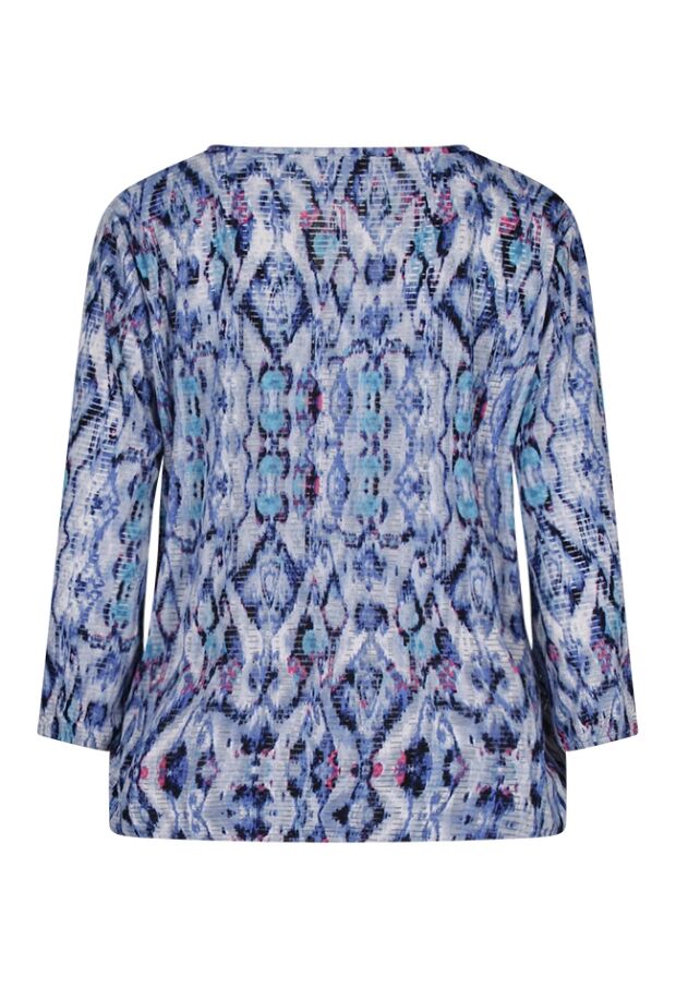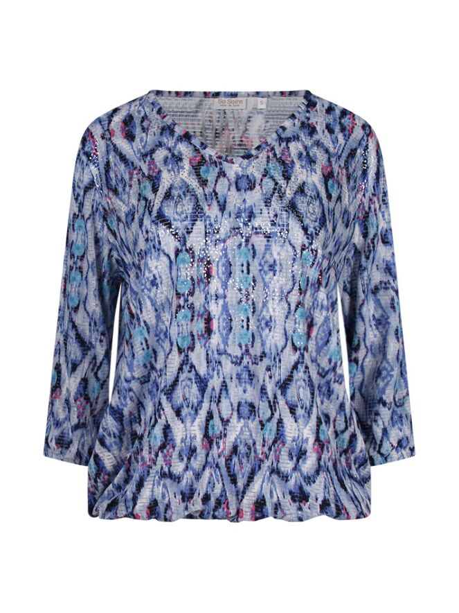 Kleurrijke top met driekwart mouw, V-hals en een subtiel spetter glitter patroon voorop. Leuk te dragen op een korte broek voor een casual sportieve look.