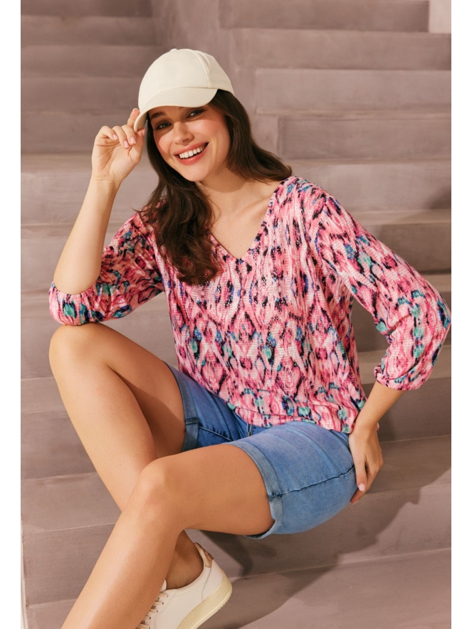 Kleurrijke top met driekwart mouw, V-hals en een subtiel spetter glitter patroon voorop. Leuk te dragen op een korte broek voor een casual sportieve look.